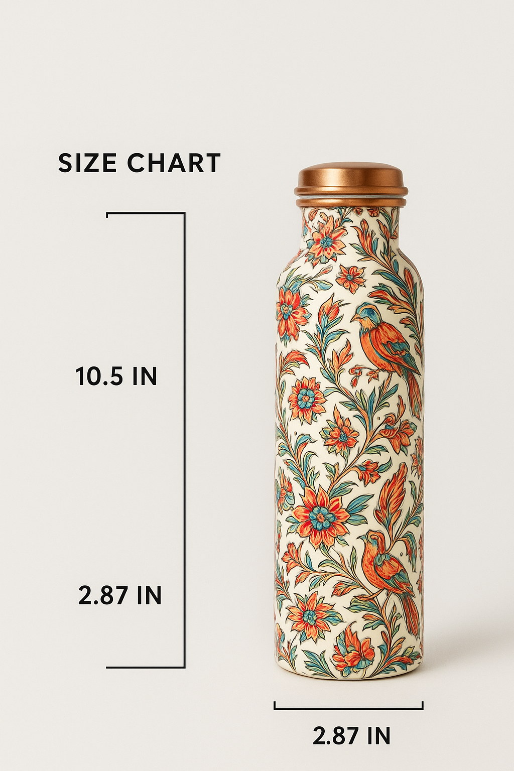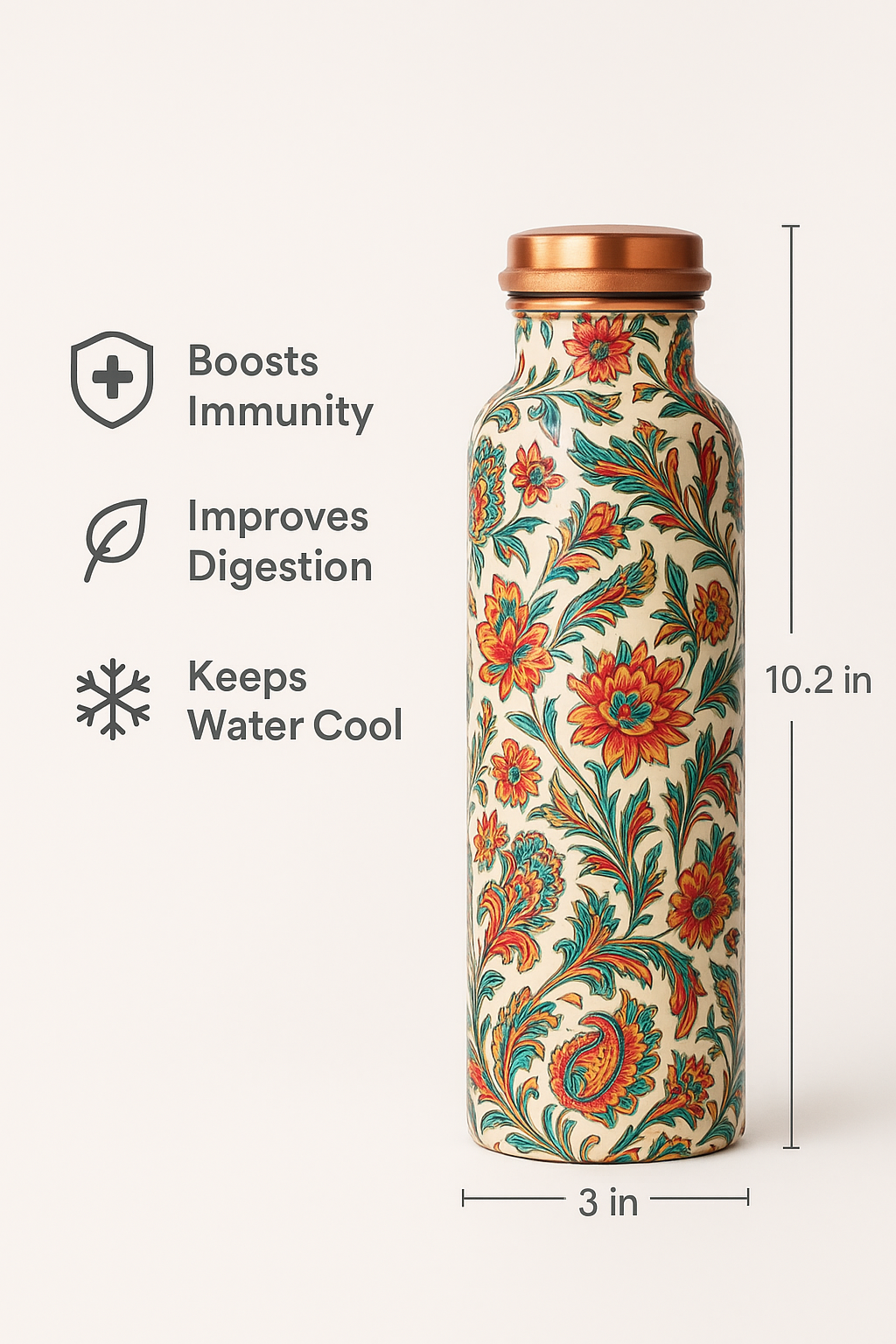 The Shivara Meena Design Copper Bottle combines the healing wisdom of Ayurveda with the timeless beauty of traditional Meenakari artistry. Adorned with vibrant enamel designs, this bottle is not just for hydration—it’s a piece of cultural heritage and luxury that makes every sip a celebration of health and elegance.