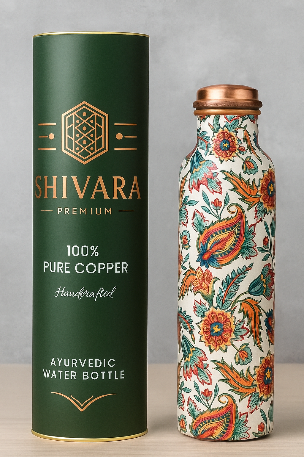In Ayurveda, water stored in copper vessels is considered charged with natural energy that balances the body’s three doshas—Vata, Pitta, and Kapha. Drinking this water daily helps cleanse toxins, promote joint health, and support overall wellness. With Shivara’s Meena Design Bottle, you enjoy wellness wrapped in beauty.
